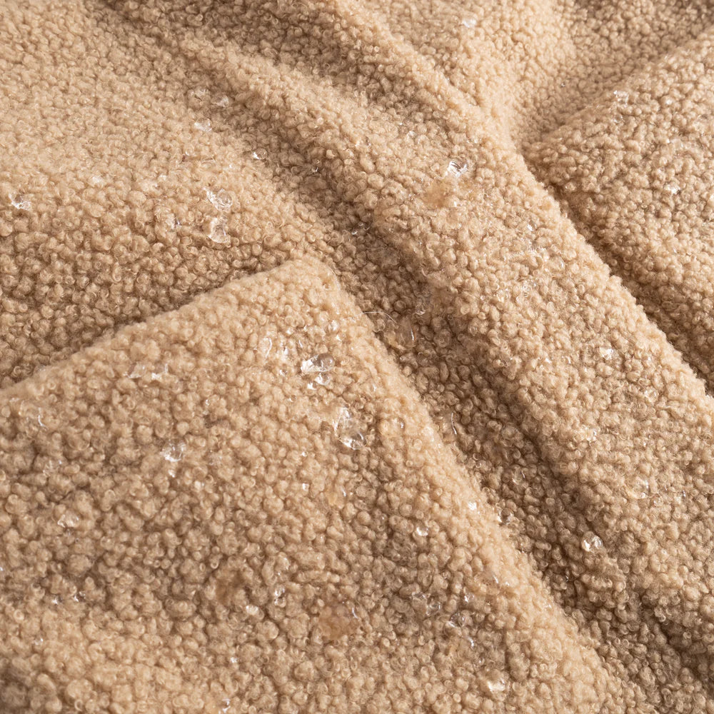 Longer jacket from MINI A TURE made from soft, waterproof teddy sherpa. Perfect for transitional weather and seasons. The jacket has two front pockets, has a hidden zipper at the front as well as snap buttons. Note that the material is waterproof, however the anorak does not have taped seams.
