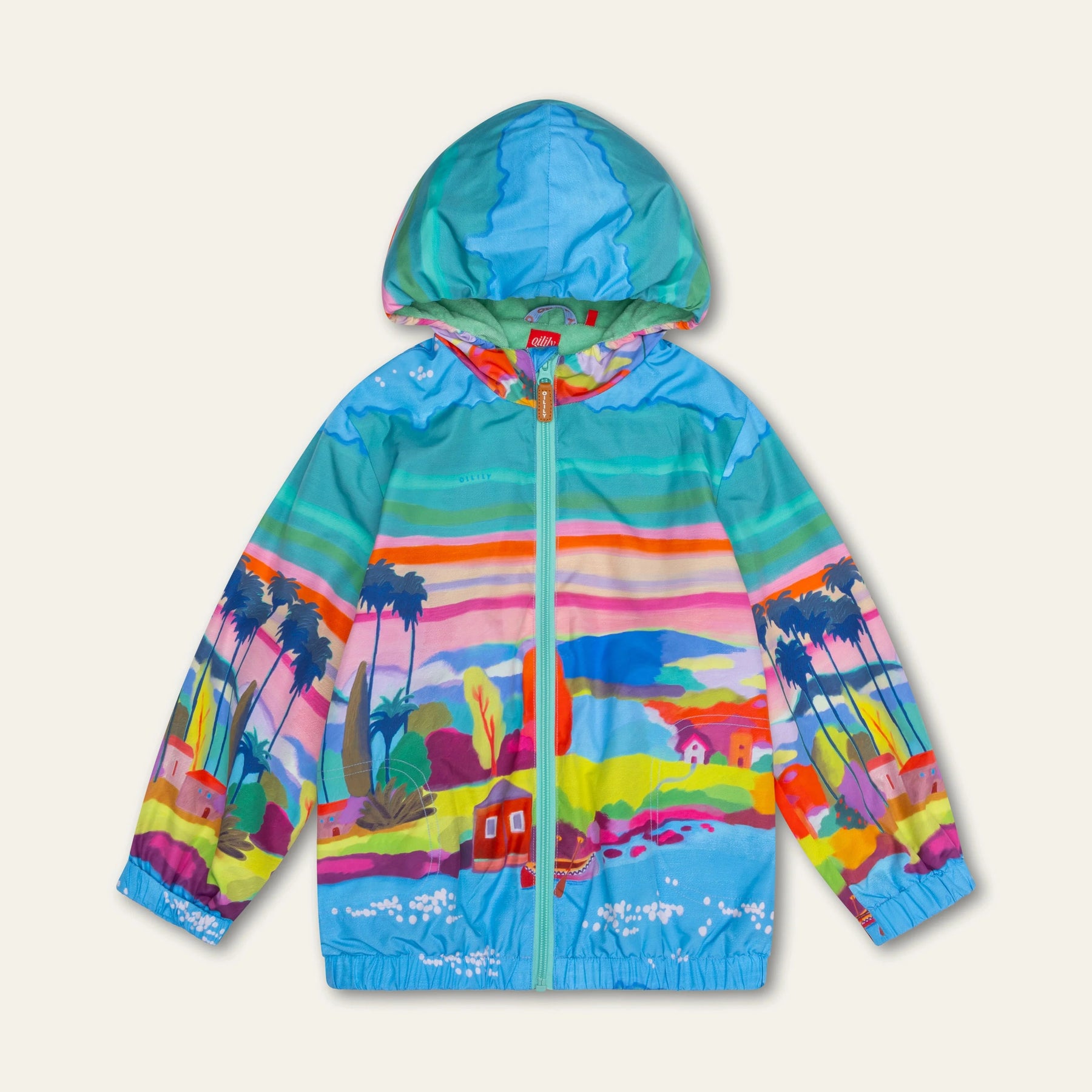 You're ready to go in this cheerful coat! The print Hike View is a digital drawing of lovely views in lush, bright colours with water paint effect. With handy hood and zipper.