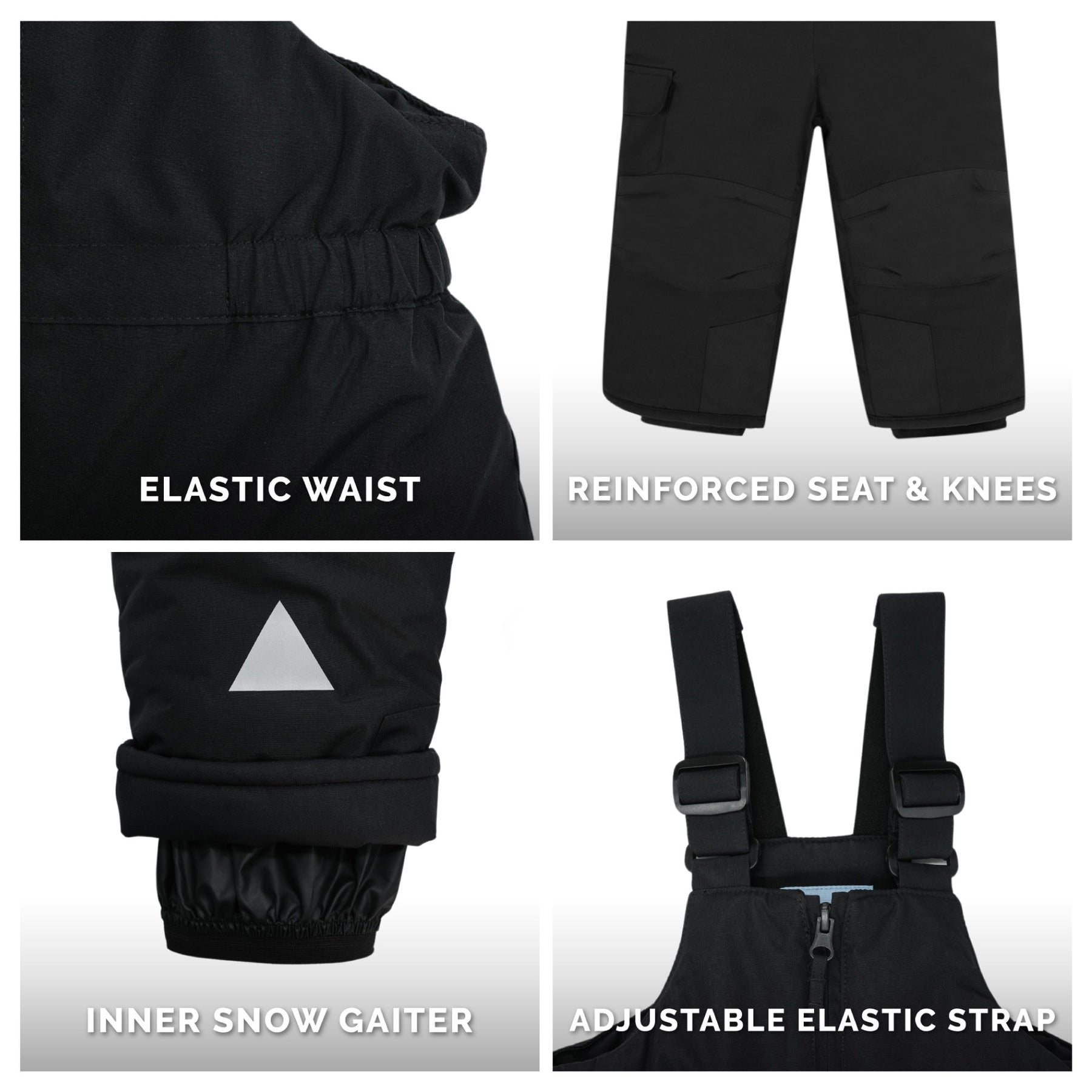 Say goodbye to legs riding up with built-in elastic gaiters, perfect for pulling over snow boots. Includes a Velcro pocket to hold all those little treasures. Got a kid who plays hard? Our snow bibs are built tough with reinforced seat, knee, and ankle panels. Includes safety reflective features throughout for visibility on short winter days. With Toasty-Dry Snow Bib Pants, your toddler will stay protected and comfortable all season!