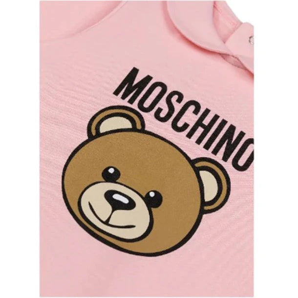 Introducing the baby boys blue teddy onesie by Moschino, made from soft cotton and featuring a signature teddy print design. Complete with a black logo branding on the chest, this onesie is perfect for your little one's comfort and style.
