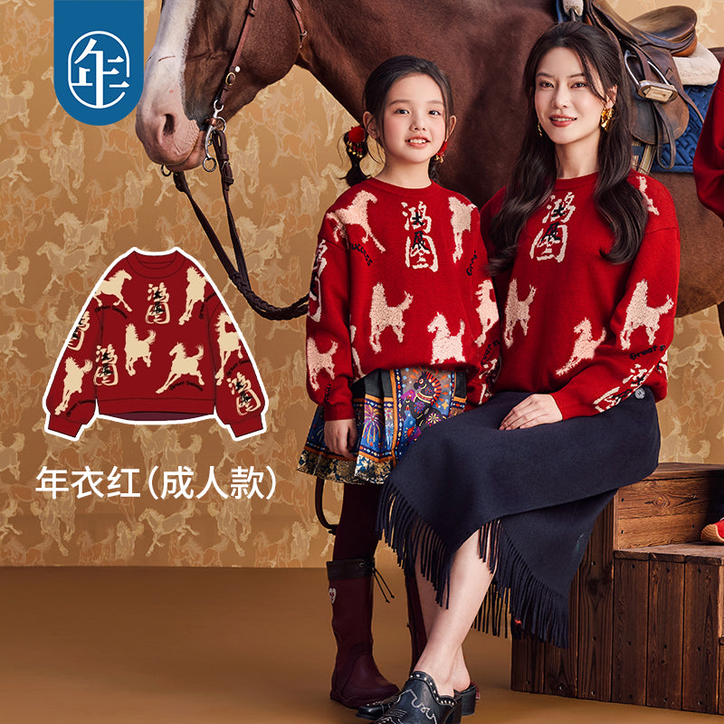 >Nian 年衣 成人亲子款 鸿图群奔毛衣 - 年衣红