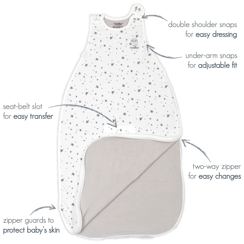 Unlike other brand sleep sacks that come in either winter or summer weight/TOG rating, the Woolino 4 Season Sleep Bag can be used year-round. It’s suitable for room temperature 63-75F (17-24C). Because of merino’s unique ability to regulate body temperature, it helps keep your baby warm when it's cold and cool when it's hot. - Grows with your baby