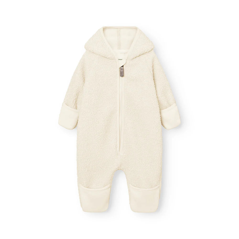 Soft teddyfleece jumpsuit from MINI A TURE made from recycled polyester. The jumpsuit comes with a soft fleece lining and has a pointed, signature hood with tassel at the top. In sizes 1m/56cm to 6m/68cm the sleeves and legs have fold-up mittens and socks. From size 9m/74cm and upwards, sleeves and legs are completed with a ribbed edge.
